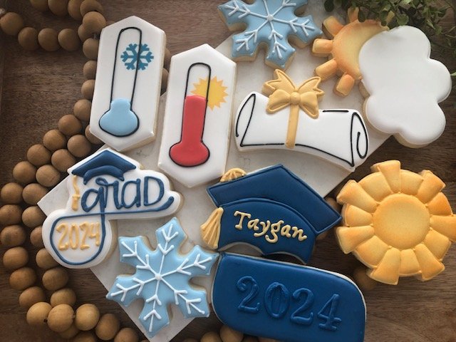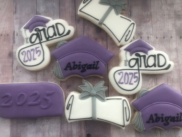 Customize your graduation set just the way you like it.  This dozen set of cookies are vanilla almond flavored with vanilla royal icing.  Local pick up only