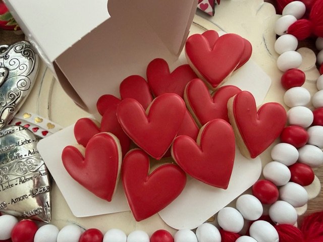 Who wouldn’t love a box of red Valentine cookies? This set comes with 12 mini cookies heat sealed individually in a box with a bow. They are vanilla almond cookies with vanilla royal icing. Local pick up February 12-13